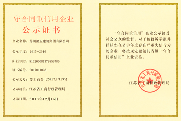 近日,集團公司榮獲“2015-2016江蘇省重合同守信用企業(yè)”榮譽稱號,這是集團公司連續(xù)十次蟬聯(lián)“江蘇省重合同守信用企業(yè)”。