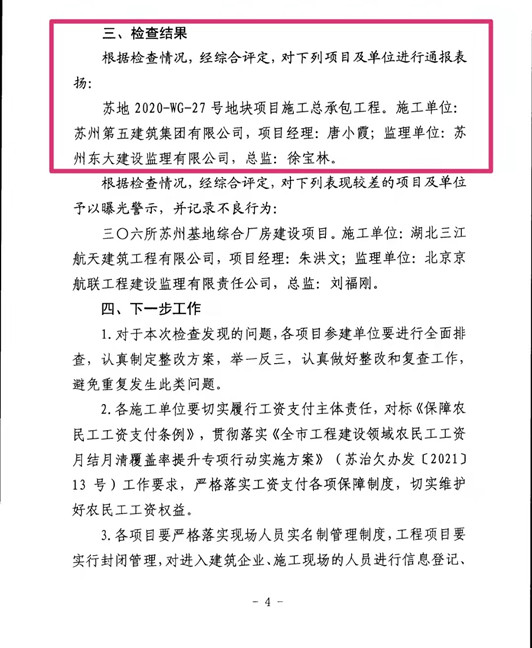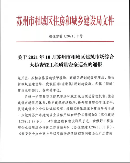 熱烈祝賀集團(tuán)公司蘇地2020-WG-27號地塊項目施工總承包工程,在2021年10月蘇州市相城區(qū)建筑市場綜合大檢查暨工程質(zhì)量安全巡查通報中,以96.25分名列第一名,獲通報表揚(yáng)。一份耕耘,一份收獲。籍此佳績,項目部要再接再厲,永創(chuàng)一流!