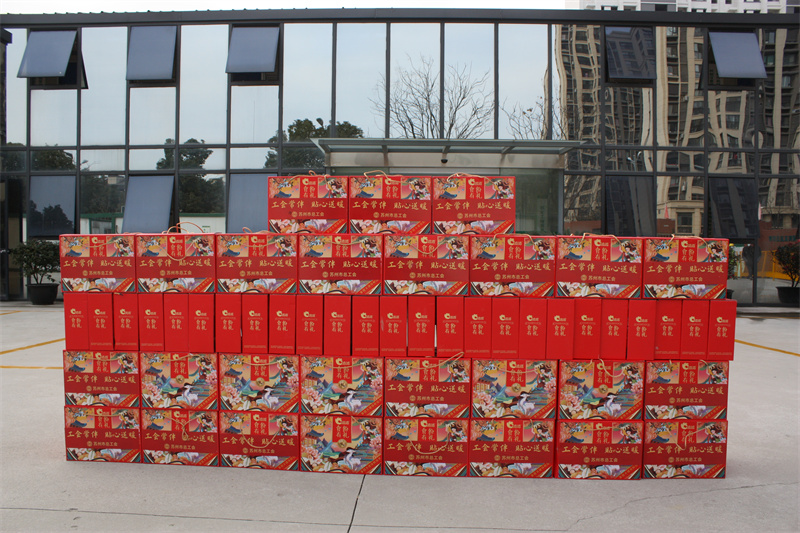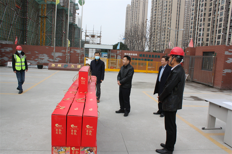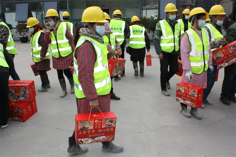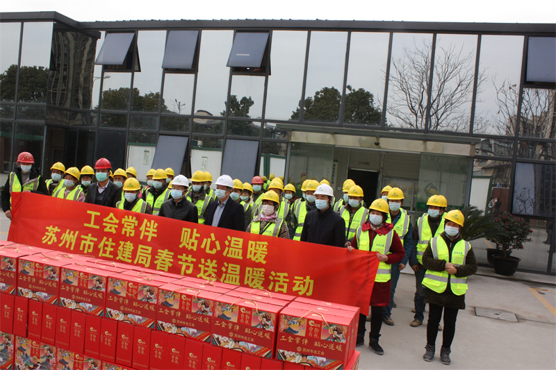 1月18 日上午,蘇州市住建局黨組成員、副局長陳建忠,蘇州市住建局機關工會主席王勇一行蒞臨集團公司承建的尹西一村安置小區項目,開展“工會常伴 貼心溫暖”的冬日暖心主題活動,向100余名在冬日的嚴寒中堅守崗位的一線員工發放了真情滿滿的春節大禮包。集團公司董事長顧建方、集團副總監顧建良、工會主席石靜陪同出席。