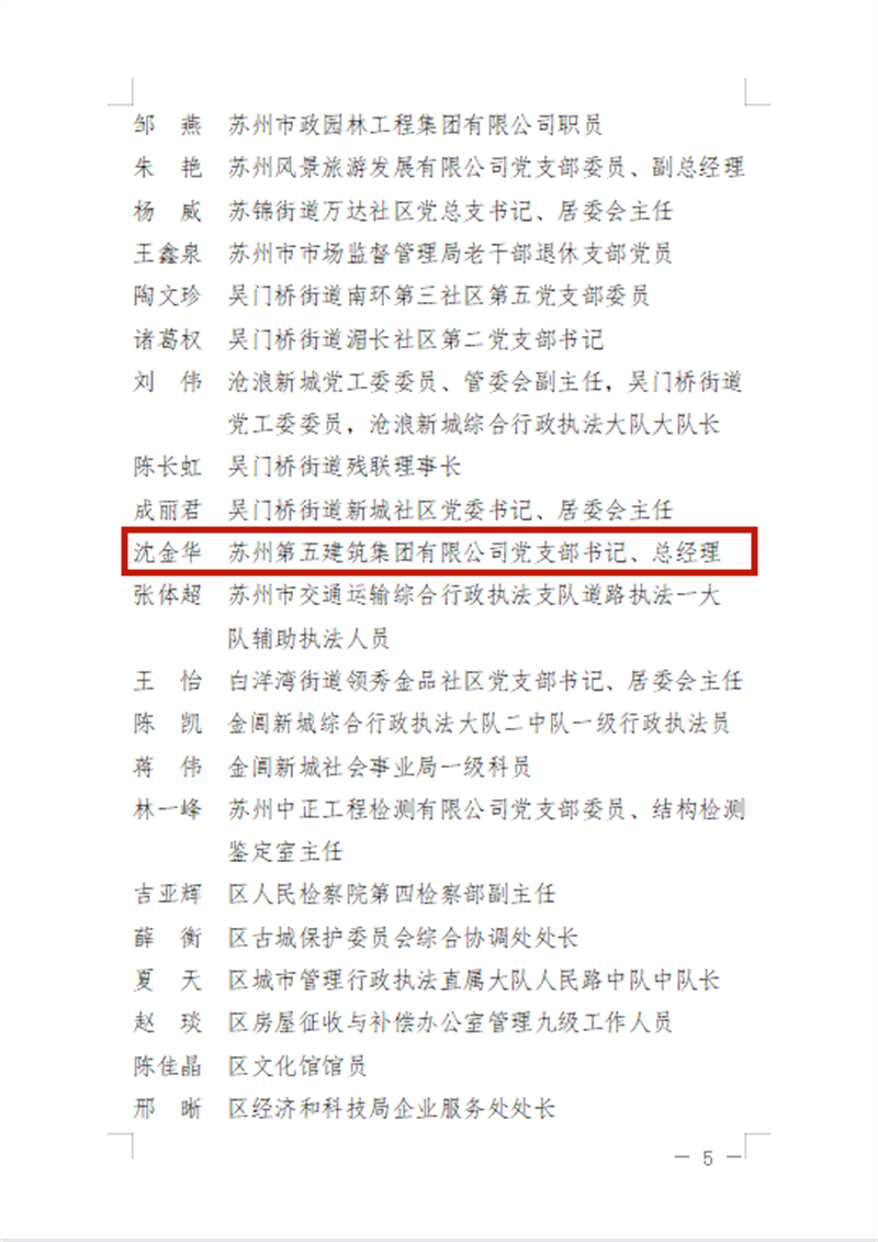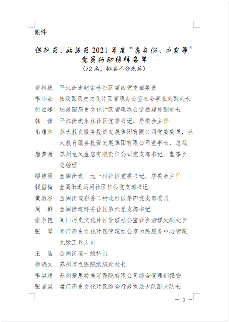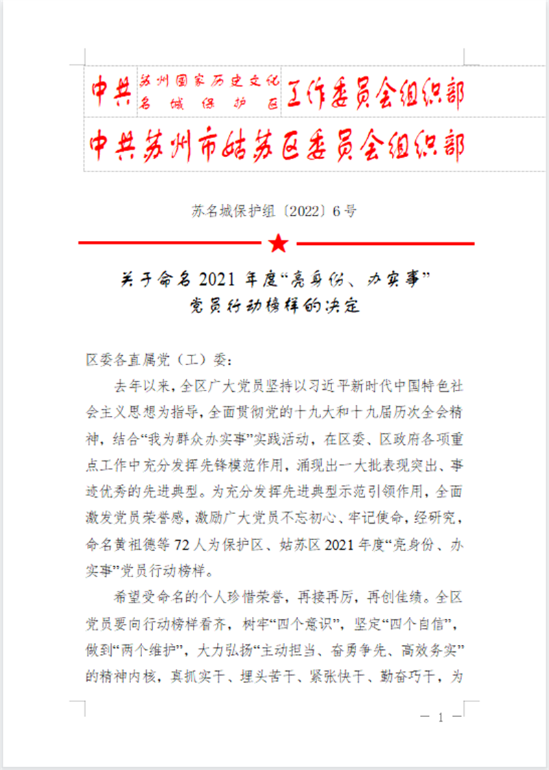2022年2月7日,中共蘇州國家歷史文化名城保護區工委組織部、中共蘇州市姑蘇區委組織部下發了關于命名2021年度“亮身份、辦實事”黨員行動榜樣的決定,集團公司黨支部書記、總經理沈金華名列榜單。