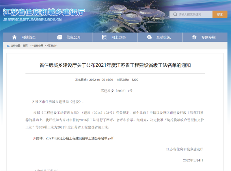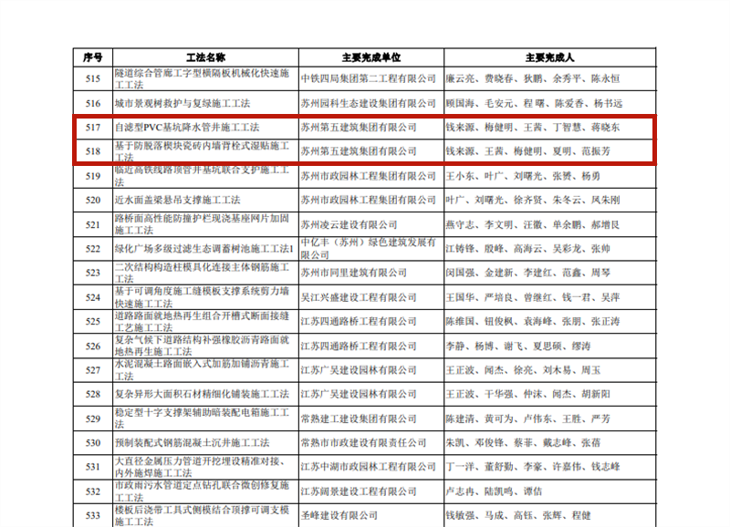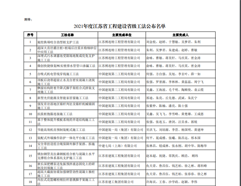 省住房城鄉建設廳蘇建質安〔2022〕1號關于公布2021年度江蘇省工程建設省級工法名單的通知,集團公司自濾型PVC基坑降水管井施工工法、基于防脫落楔塊瓷磚內墻背栓式濕貼施工工法喜獲殊榮。