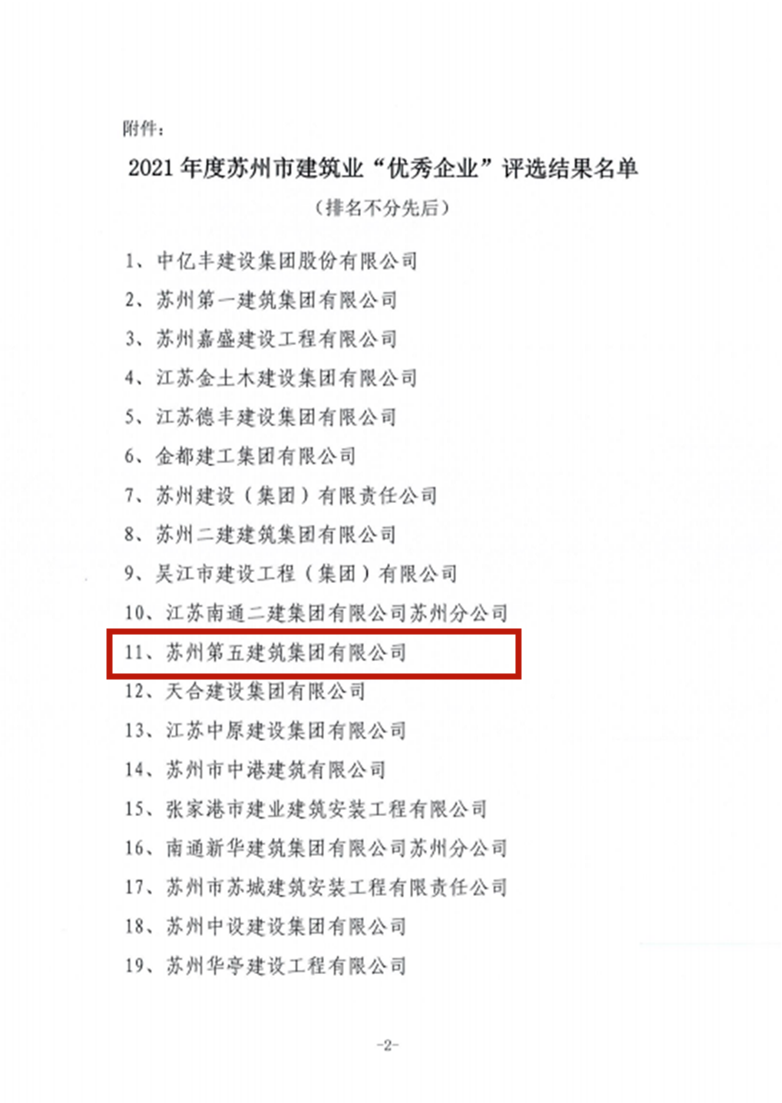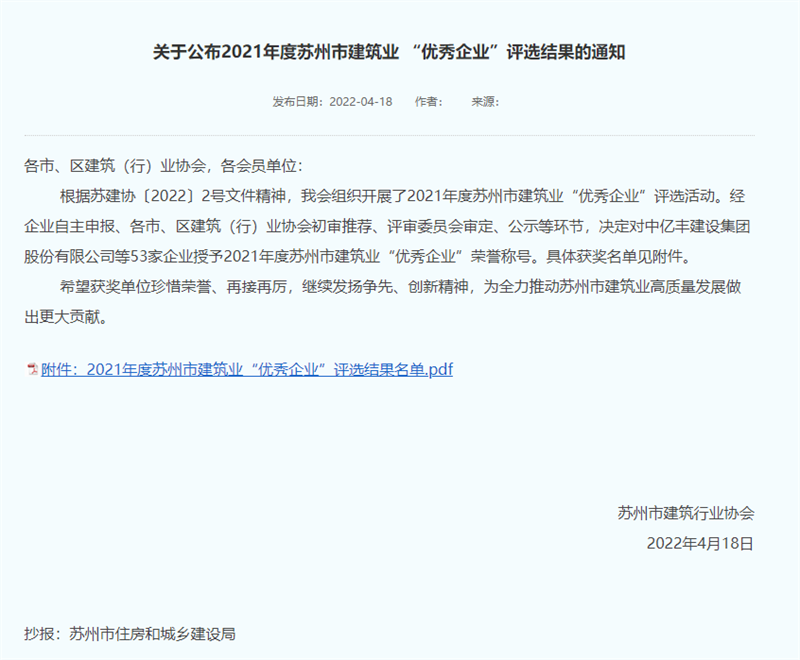 4月18日,集團(tuán)公司在2021年度蘇州市建筑業(yè)“優(yōu)秀企業(yè)”評(píng)選活動(dòng)中脫穎而出。此次的評(píng)選是充分發(fā)揮我市優(yōu)秀企業(yè)的示范引領(lǐng)作用,加快推進(jìn)優(yōu)勢(shì)企業(yè)轉(zhuǎn)型、創(chuàng)新發(fā)展,進(jìn)一步提升全市建筑業(yè)高質(zhì)量發(fā)展水平。集團(tuán)公司會(huì)再接再厲,以高度的責(zé)任感和榮譽(yù)感,創(chuàng)新?tīng)?zhēng)優(yōu),再創(chuàng)佳績(jī)!