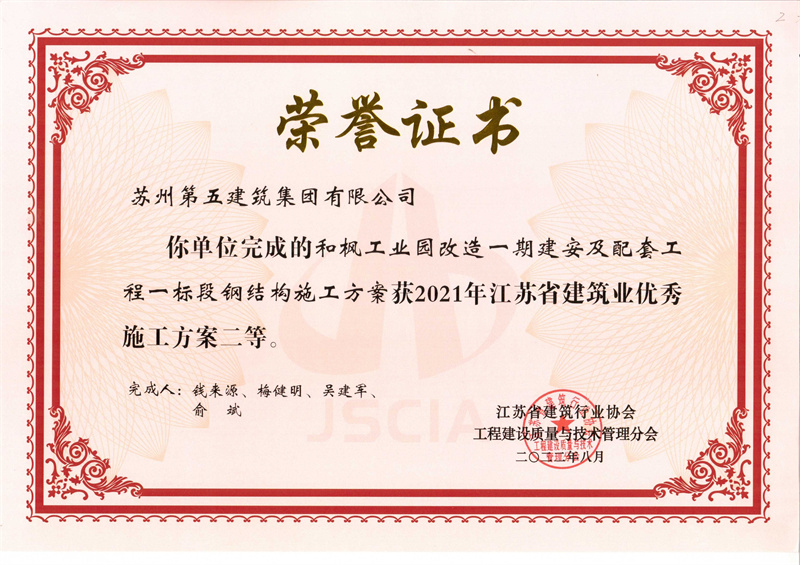 集團公司和楓工業園改造一期建安及配套工程一標段鋼結構施工方案花籃懸挑外腳手架施工方案被江蘇省建筑行業協會工程建設質量與技術管理分會評為2021年江蘇省建筑業優秀施工方案二等獎