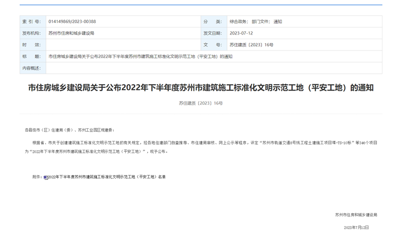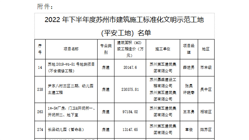 7月12日,蘇州市住房城鄉建設局 蘇住建質〔2023〕16號關于公布2022年下半年度蘇州市建筑施工標準化文明示范工地(平安工地)的通知,集團公司蘇地2019-WG-51號地塊、尹東八村三區二期、幼兒園土建工程、燕河廠房、長涇幼兒園四個項目榜上有名。