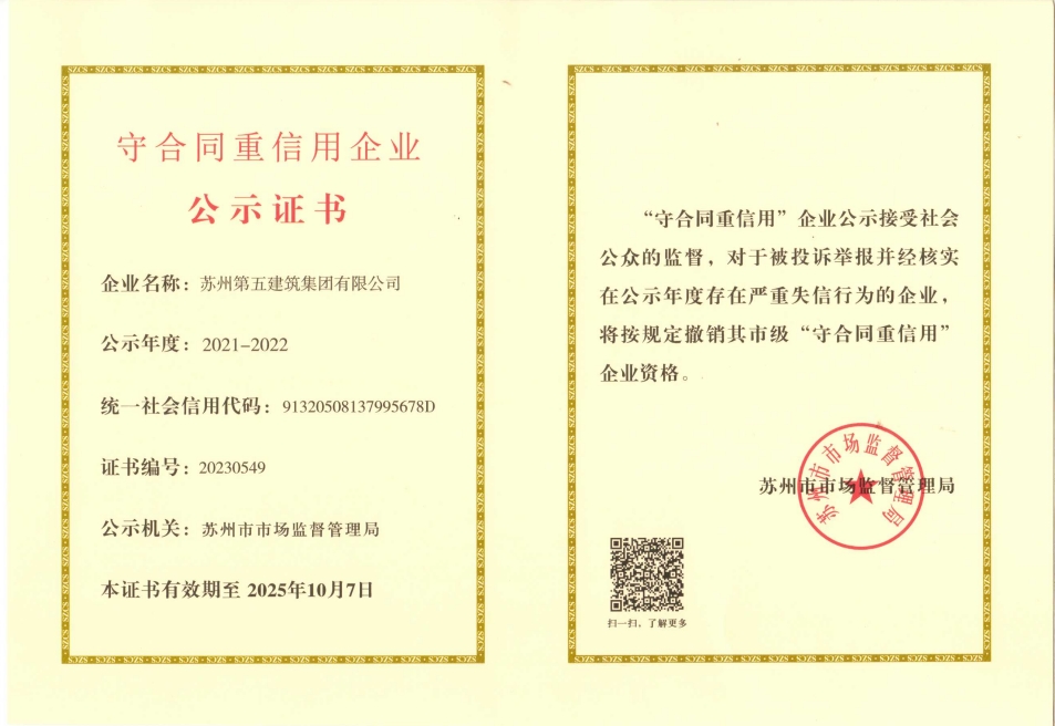 10月20日,蘇州市市場監督管理局通知2021-2022年度市級守合同重信用企業名單,集團公司名列其中,獲得該項榮譽稱號。