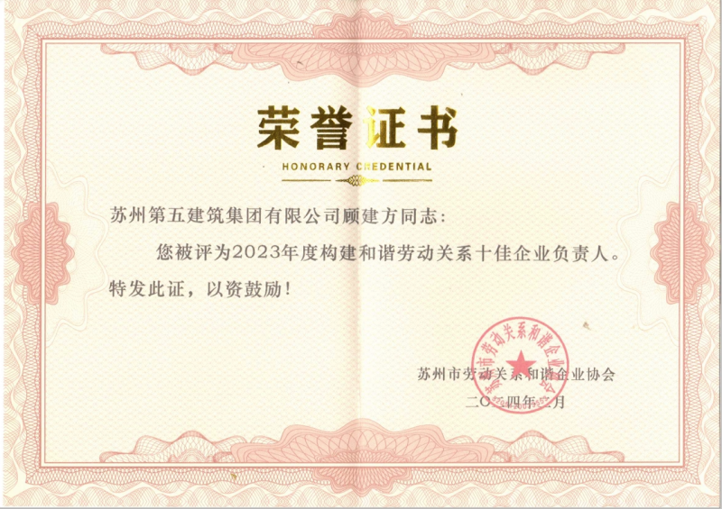 2024年2月1日,蘇州市勞動(dòng)關(guān)系和諧企業(yè)協(xié)會(huì)第二屆第一次全體會(huì)員大會(huì)暨全市和諧勞動(dòng)關(guān)系創(chuàng)建工作總結(jié)授牌會(huì)議,在越溪文體中心一樓報(bào)告廳順利舉行。集團(tuán)公司董事長顧建方榮獲構(gòu)建和諧勞動(dòng)關(guān)系十佳企業(yè)負(fù)責(zé)人。