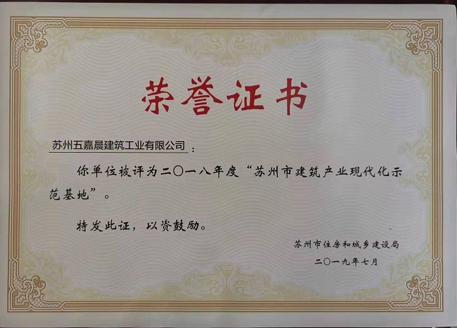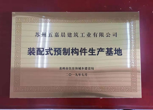 經(jīng)市住建局、財政局等部門組織專家組實地調研核實、評審,集團五嘉晨建筑工業(yè)有限公司被評為“裝配式預制構件生產(chǎn)基地”、“蘇州市建筑產(chǎn)業(yè)現(xiàn)代化示范基地”。