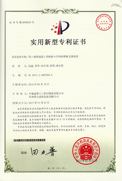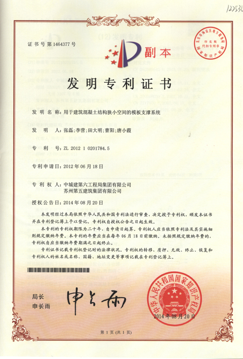 建筑混凝土結構狹小空間的模板支撐系統”專利